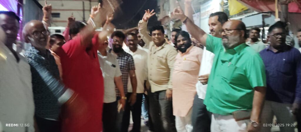 यावेळी उत्साही मराठा समाज बांधव तसेच शिवसैनिकांनी छत्रपती शिवाजी महाराज की जय, जरांगे पाटलांचा विजय असो आदींसह विविध घोषणा देत छत्रपती शिवरायांच्या पुतळ्याला पुष्पहार अर्पण केला. त्यानंतर घोषणा देत, नाचत पेढे वाटून व फ टाक्यांच्या आतषबाजीत सुमारे एक तास हा साजरा केला. समाज बांधवांच्या उत्साहाला उधाण आले होते. जरांगे पाटील यांचा विजय असो यासह विविध घोषणांनी छत्रपती शिवाजी महाराज चौक परिसर दणाणून गेला. विविध पक्ष, कार्यकर्त्यांसह मराठा समाज बांधव सहभागी झाले.